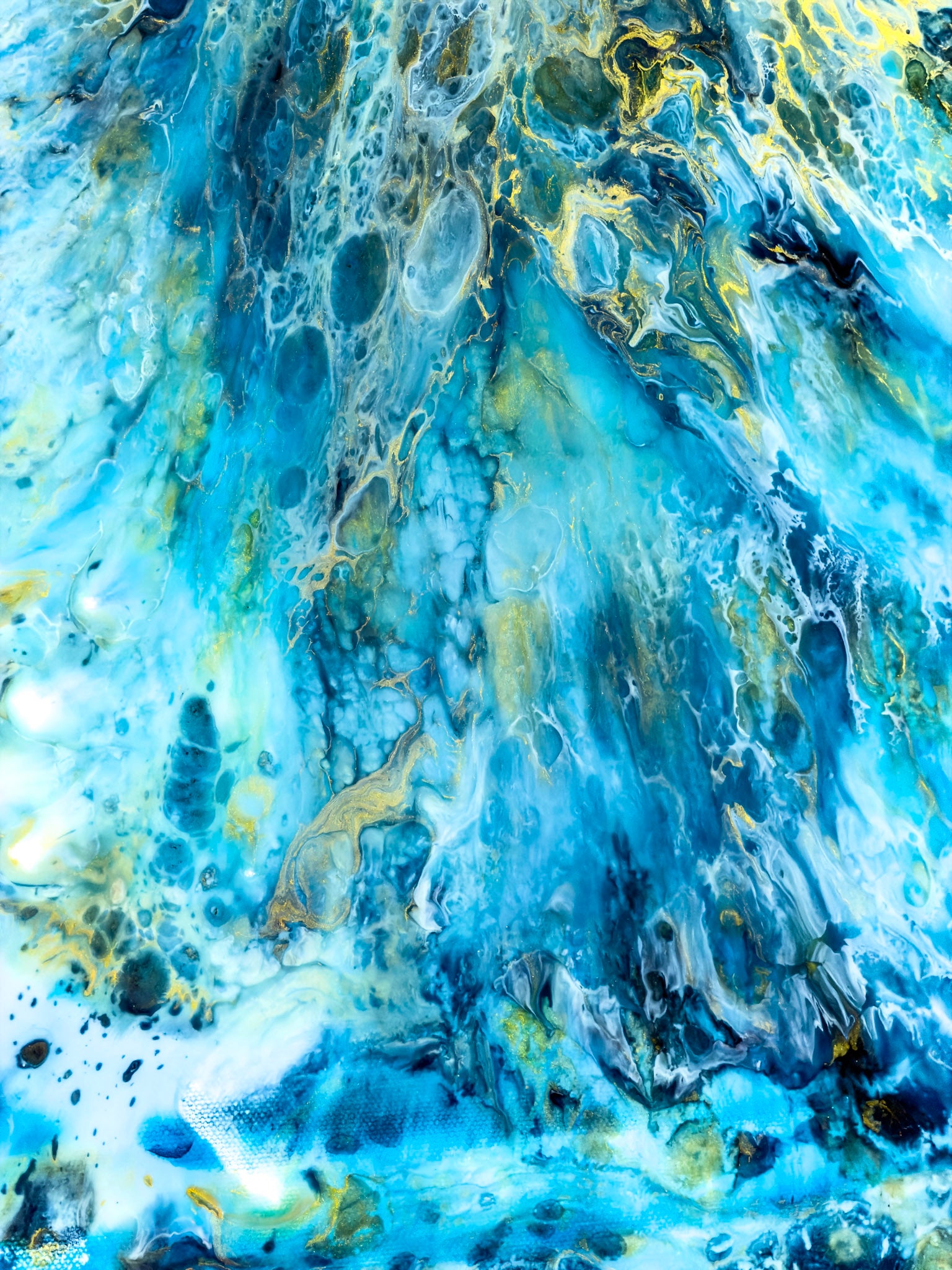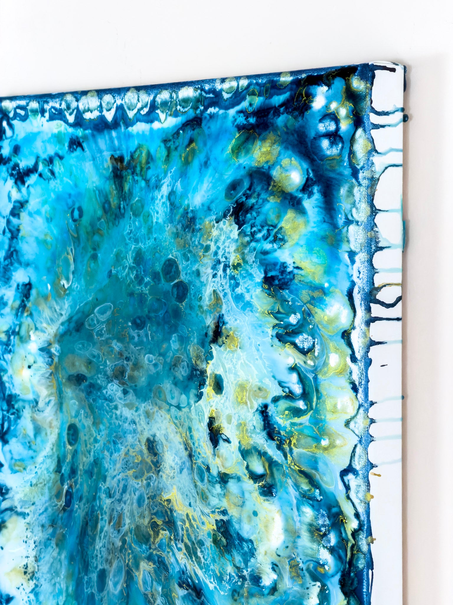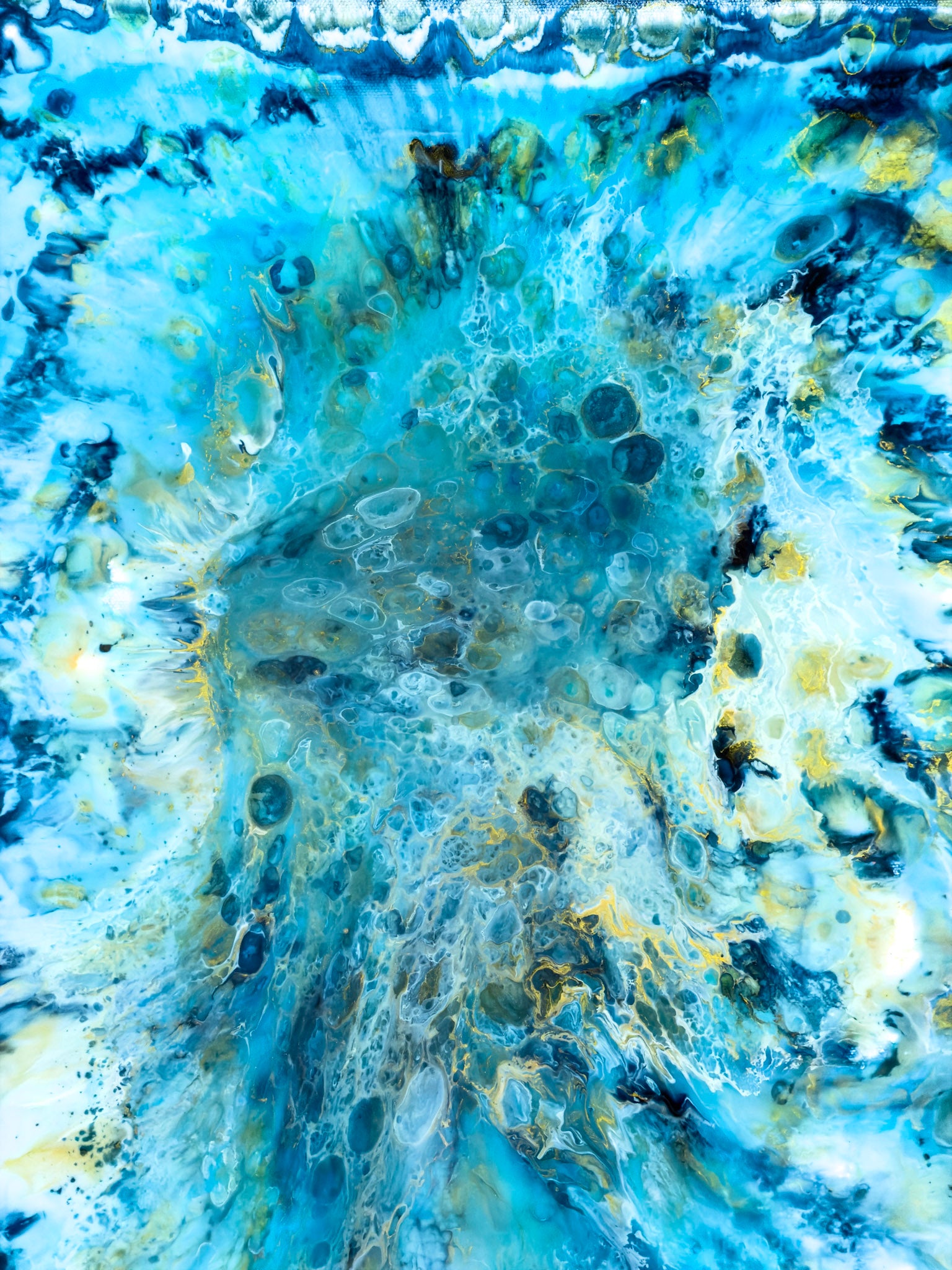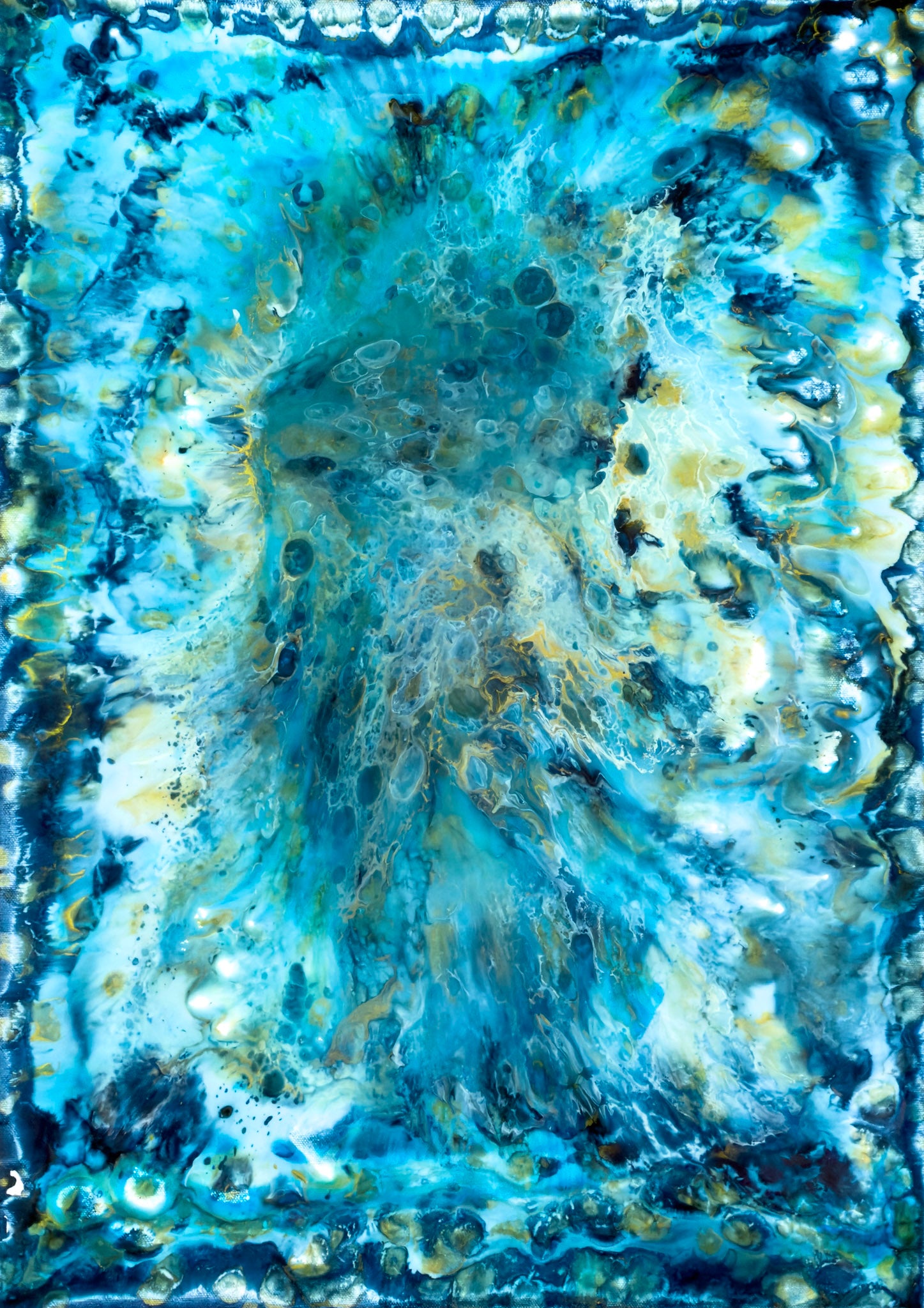 This painting is the sixth painting from my Inner Ocean series. This piece was created from a different place. Instead of directing or shaping every movement, I allowed the materials to move more freely. The process felt less controlled and more intuitive, and that shift is visible in the work. There is calm in this painting, but it is not empty calm. It holds depth. The layered resin and ink create a quiet sense of movement beneath the surface — subtle, fluid, and organic. The tones of blue and turquoise soften into one another, creating a feeling that is both grounded and expansive. This work speaks to those who value quiet luxury, people who understand that calm does not need to announce itself to be powerful. It is understated, yet it holds attention. At 50 × 70 cm in its original size, the proportions make it especially versatile. It works beautifully in entry areas, hallways, above a sideboard, or in more intimate living spaces where intention and atmosphere matter.